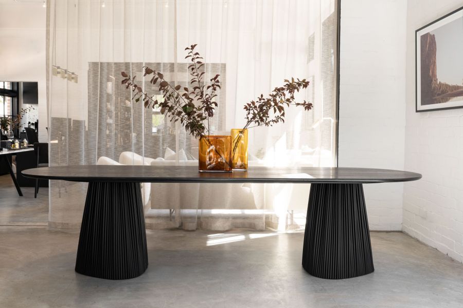 The Gathered Dining Table by Jack Flanagan for Oath, was formed as a result of exploring the transition from one two-dimensional shape morphing into another. In this case a triangle into a circle. This was used to create a flowing tapered pedestal base with a rigid steel material. The solution was to gather the steel, like in dress making.