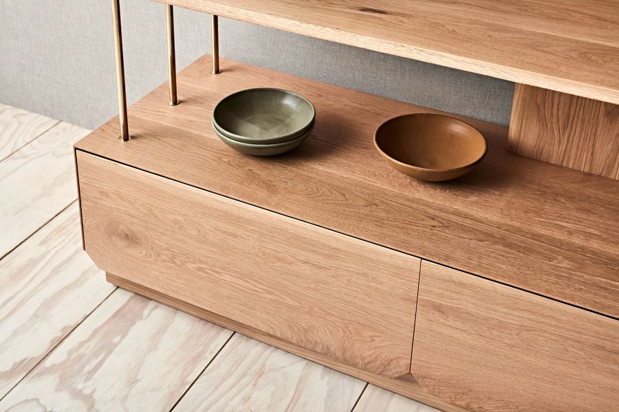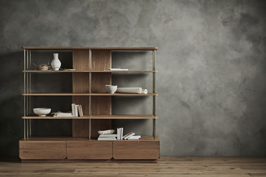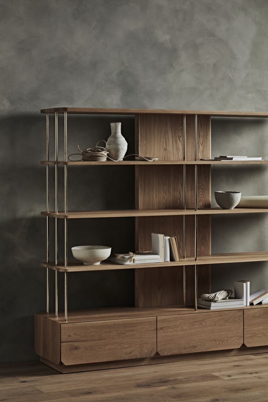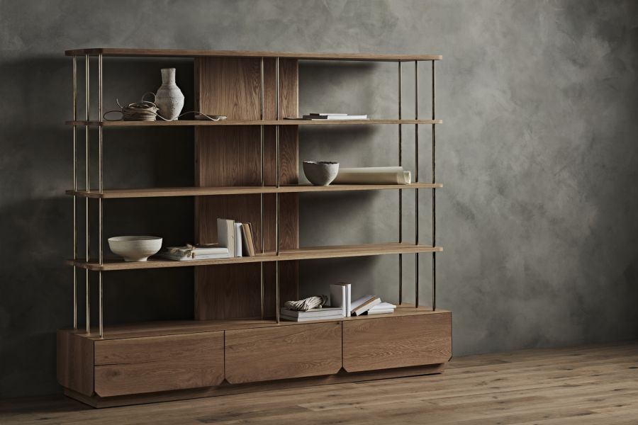 The Hilton shelf has an alternating personality – an impressive and intricate base combined with an upper shelf that is all about soft rounded corners. Brass uprights connect the two personalities together which in turn creates a shelf unit brimming with practicality and character.
