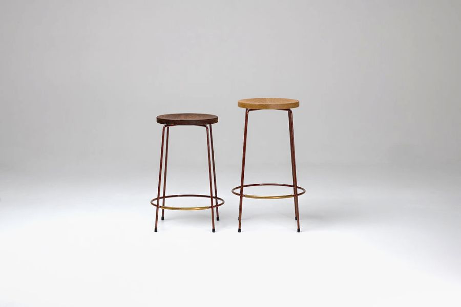 made in australia, the iva stool features a solid metal rod frame with a brass or stainless steel footrail and solid timber american oak or walnut seat. available in range of powder coat colours.