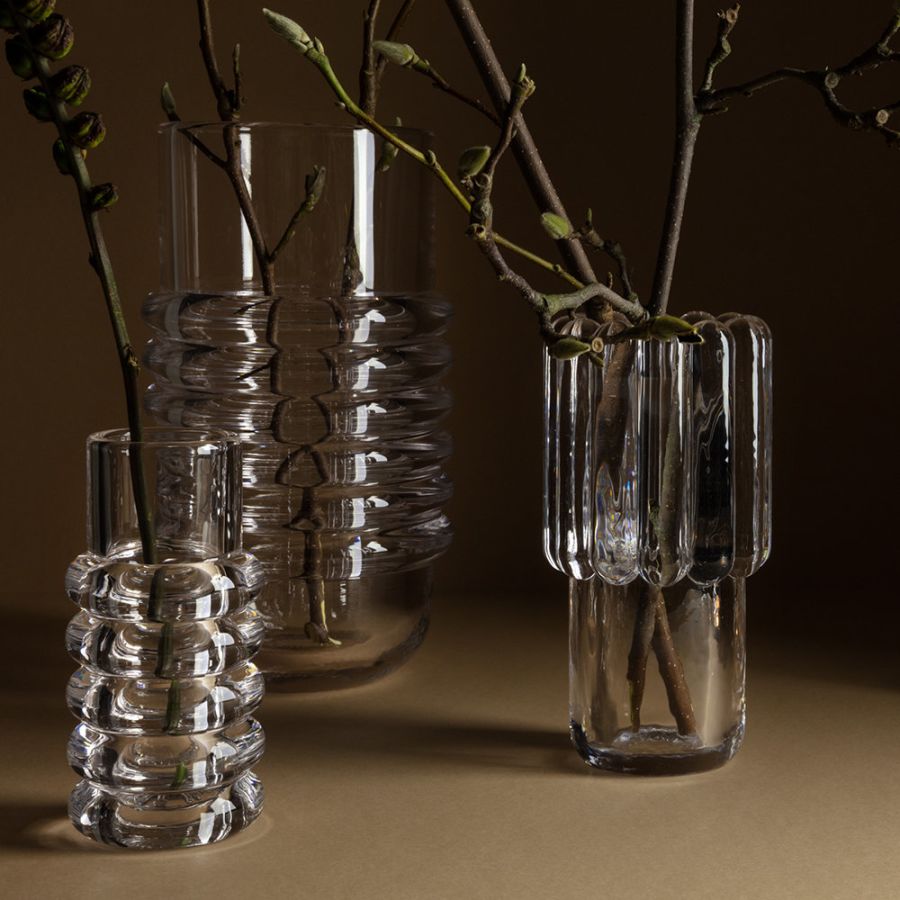 Press is a medium-sized vase, designed and engineered to catch and refract light, and to last for ever. This heavyweight grooved vase is made of fat, chunky coils of pure and clear transparent glass. Bold in silhouette and simple in function, it is manufactured by dropping big globs of molten glass at 1,200 degrees centigrade and pressed in two or three part iron moulds to create the immediately familiar silhouette.