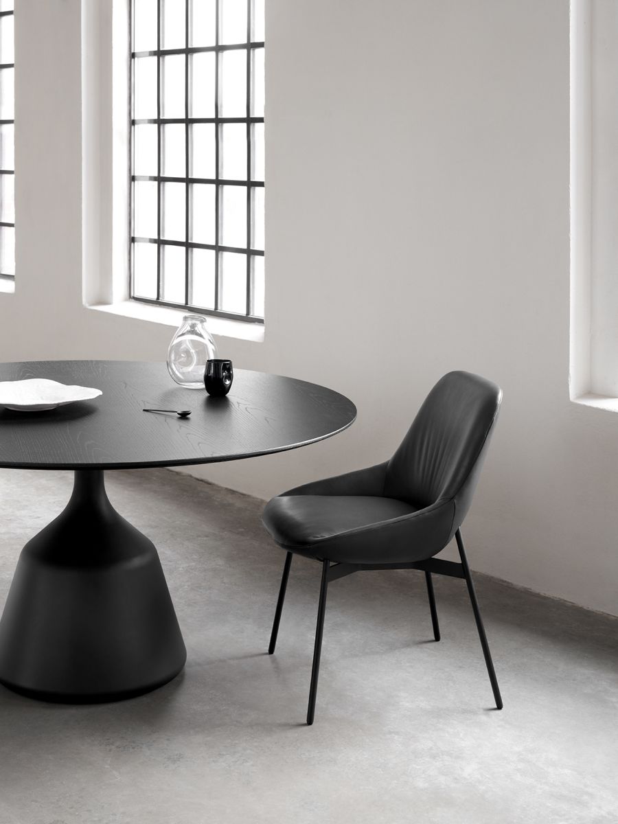 Sinum Chair is defined by an airy aesthetic and a generously upholstered shell, held in a gentle grip by a frame in black powder-coated steel.