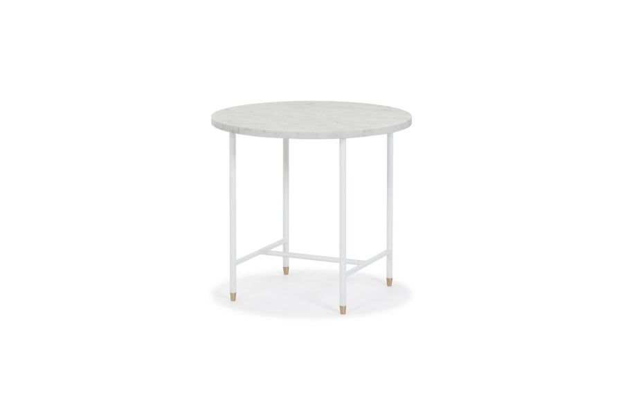 Featuring a marble top with black sand metal legs and brass adjustable feet.