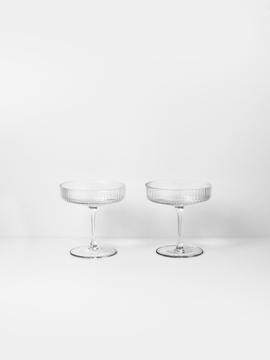 Featuring a beautifully rippled surface this set of champagne saucers presents a classic glass for sparkling wines. They are made of delicate glass mouth-blown into the mould, adding a dynamic and energetic expression to the glasses. Every glass is mouth-blown and made with love, so variations can occour.