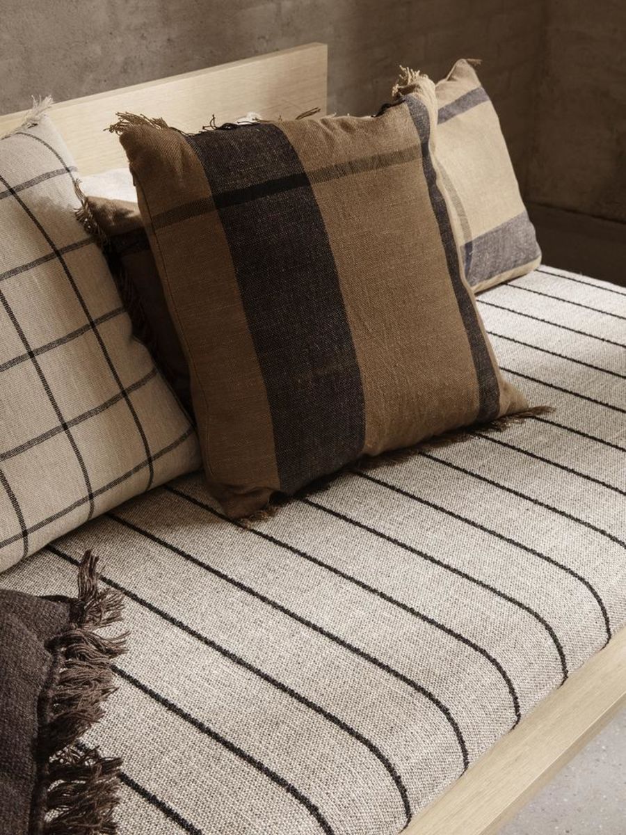 The Dry cushions are a series of cosy, plush cushions held in earth-tone colours that add a warm, inviting feeling to any space. Patterned with an oversized check, the understated design is completed by a line of fringed trim along two of its edges.
