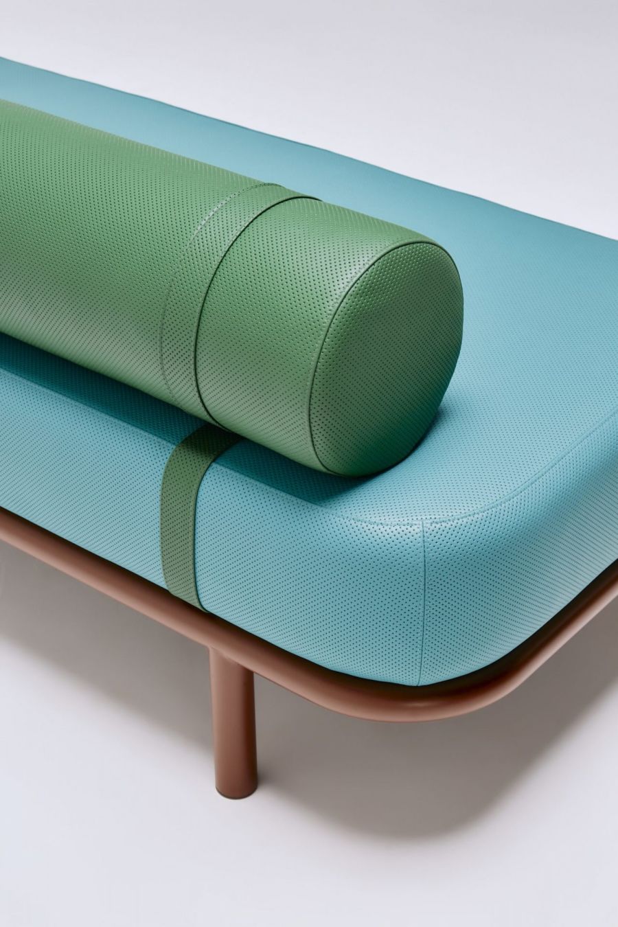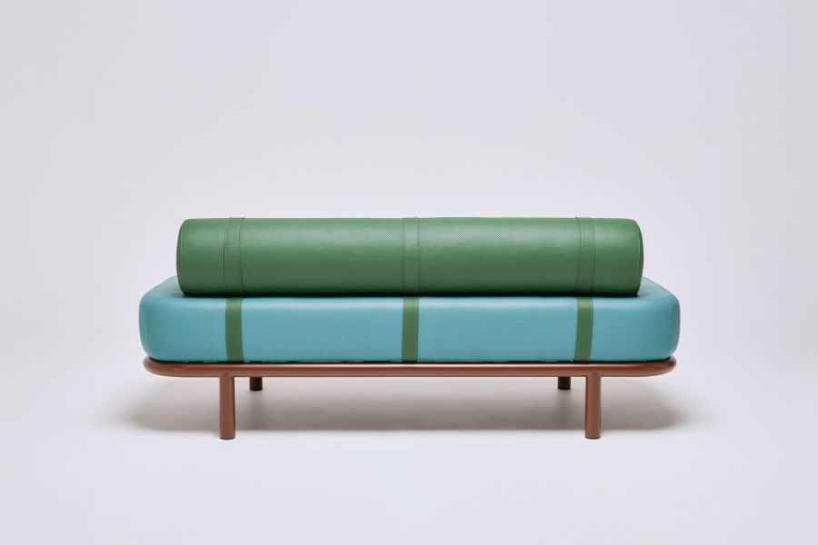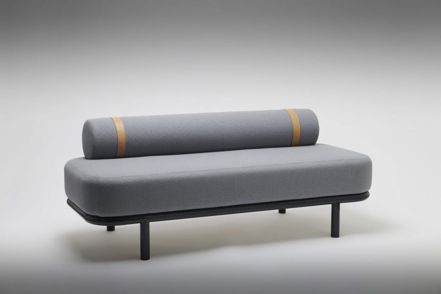 The optional bolster backrest features matching or contrasting strapping detail. a beautifully detailed stand-alone piece or flexible banquette seating option.