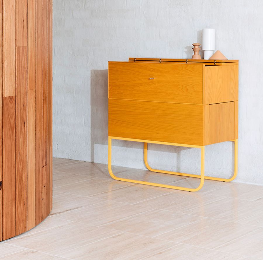 Australian made timber drinks cabinet with powder coated curved metal frame. drop down hinged front, fold up top and side drawer. custom handle details.