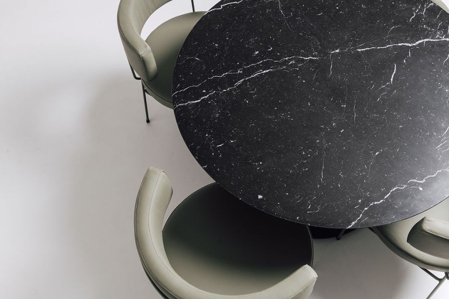 The pillar dining table is an Australian made pedestal table with round stone or timber top, powder coated double metal column and disc base.