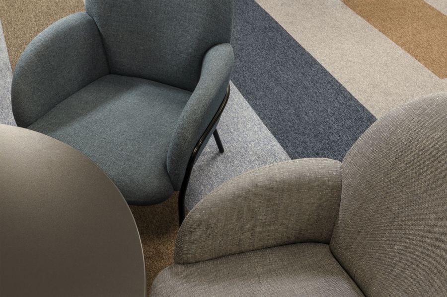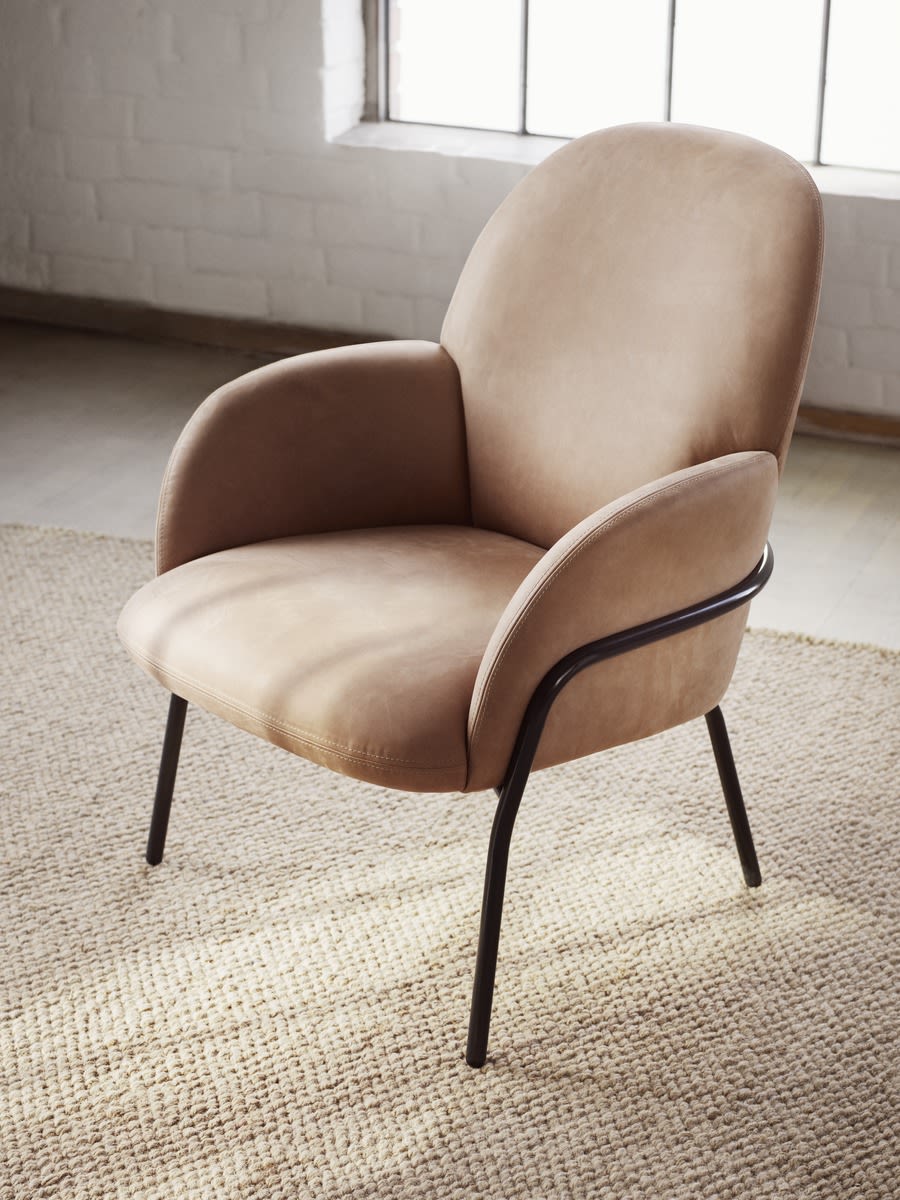 Sling is a distinctive armchair, with contrasts of hard and soft from every angle. Its metal frame gives an impression of strength, against upholstery in soft tones and tactile textile.