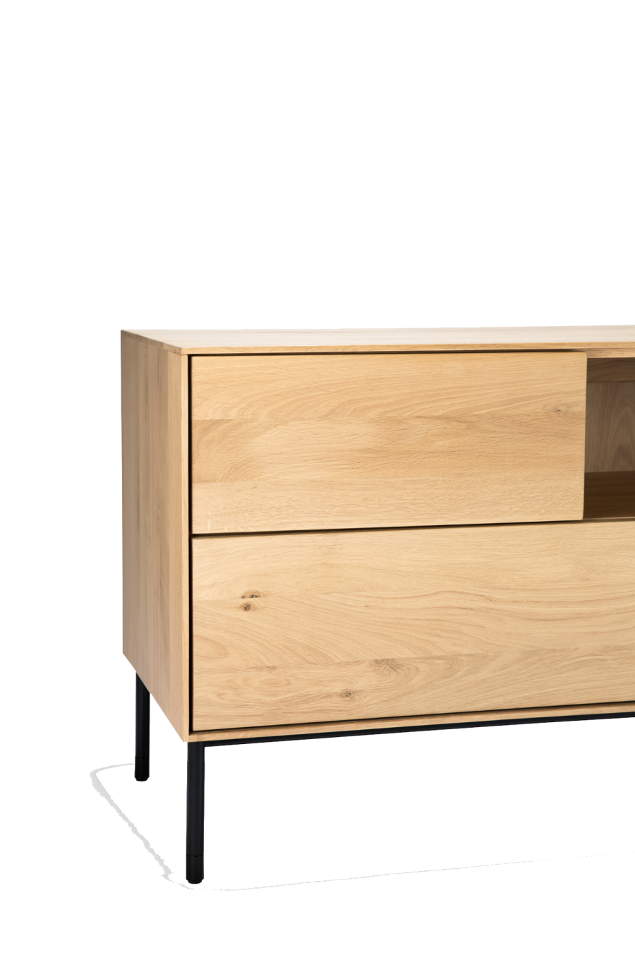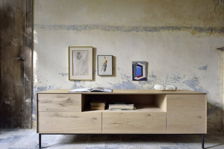 The Whitebird TV cupboard features 1 push open door, 1 flip-down door and 2 push open drawers. Made from solid oak with a varnish finish and black metal legs.