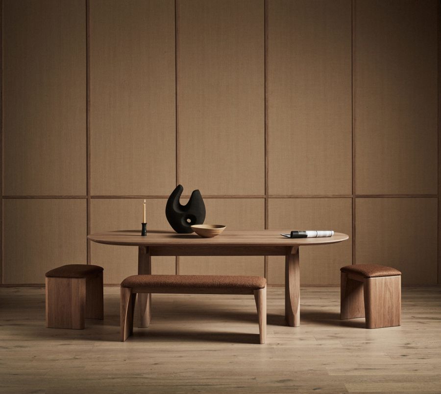 The Yorke stools and benches continue the theme of sculptural shaped legs, blending