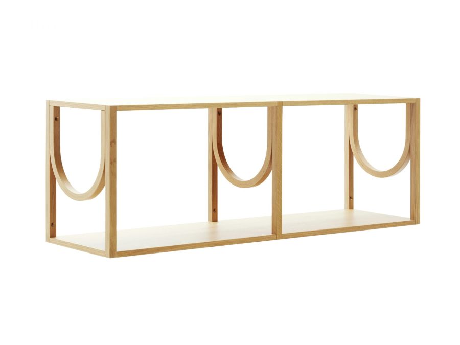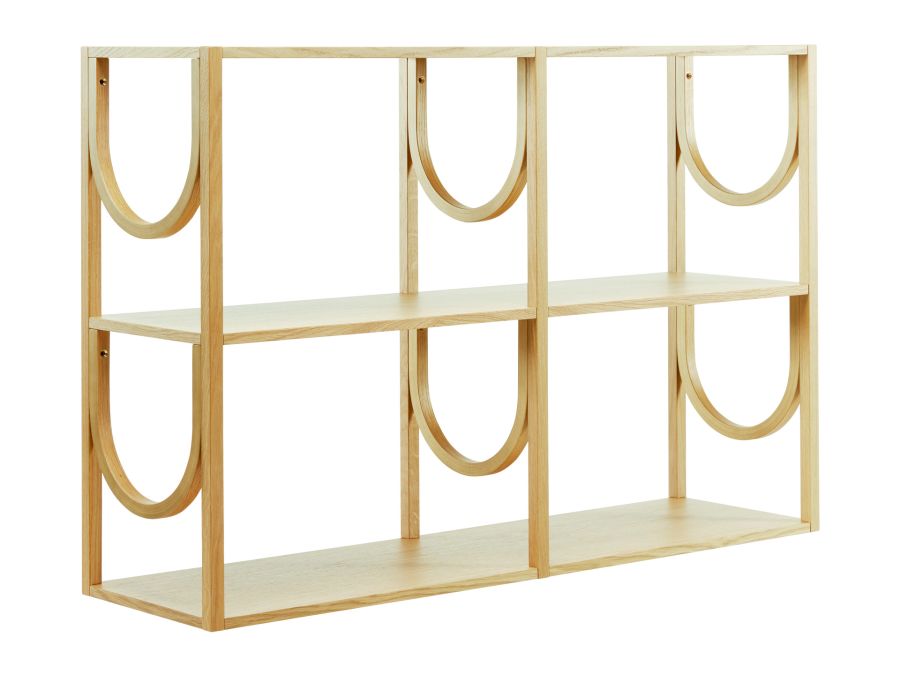 Arch is characterised by its straight lines and simple shape. Its curved bent wood bookends lend interest to its silhouette. Arch is a sturdy oak shelving system characterised by its intriguing silhouette that casts striking shadows across the walls when lit by sunshine or lamp light.