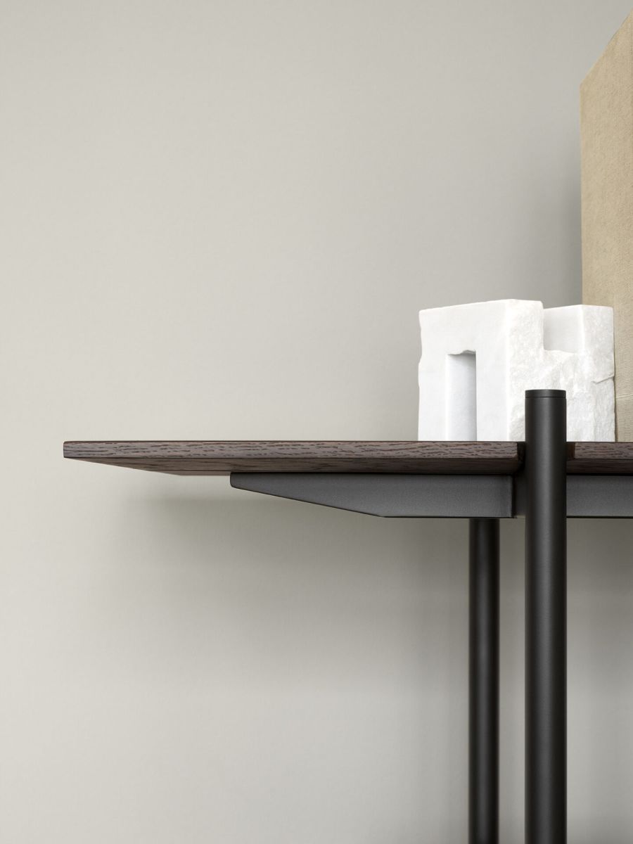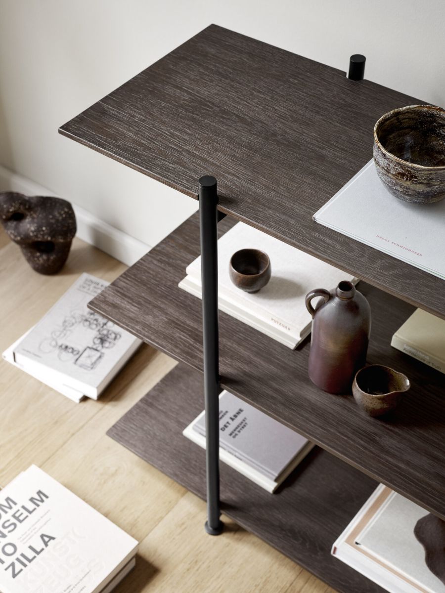 The Formal Shelving system by kindred spirit and long-time collaborator, Jonas Wagell, is constructed with only two materials. Framing and supporting the slim shelves in brown stained oak veneer, a structure consisting of horizontal and vertical trussed poles in black powder-coated steel creates a sturdy grid with subtle joints.
