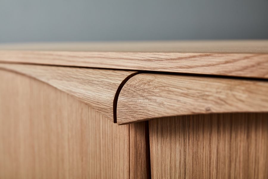 The carcase is made from American Oak veneered plywood with solid timber edging, and we use a combination of conventional and shop made knife hinges to maintain the internal aesthetics of the piece.