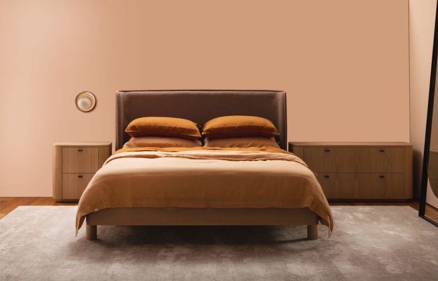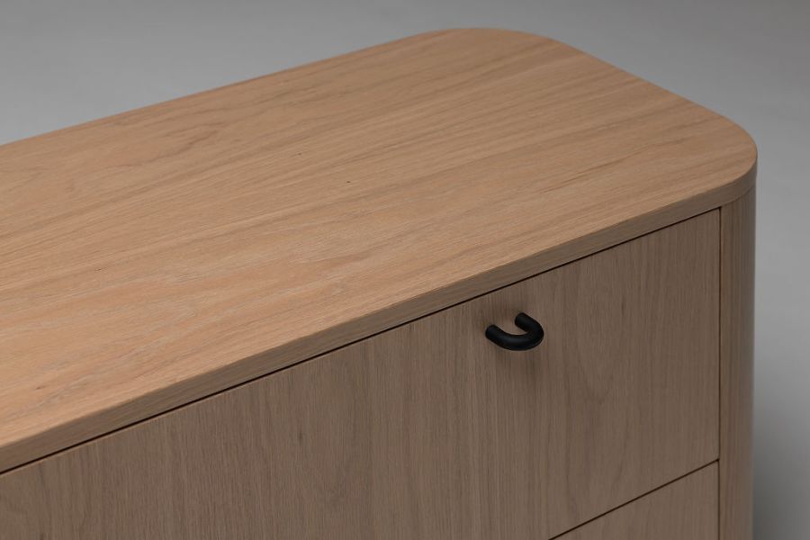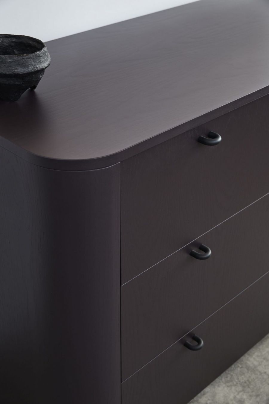 Australian made timber veneer chest of drawers with feature curve corners and inset plinth base. Triple drawer to tall boy, all with rubber handle detail.