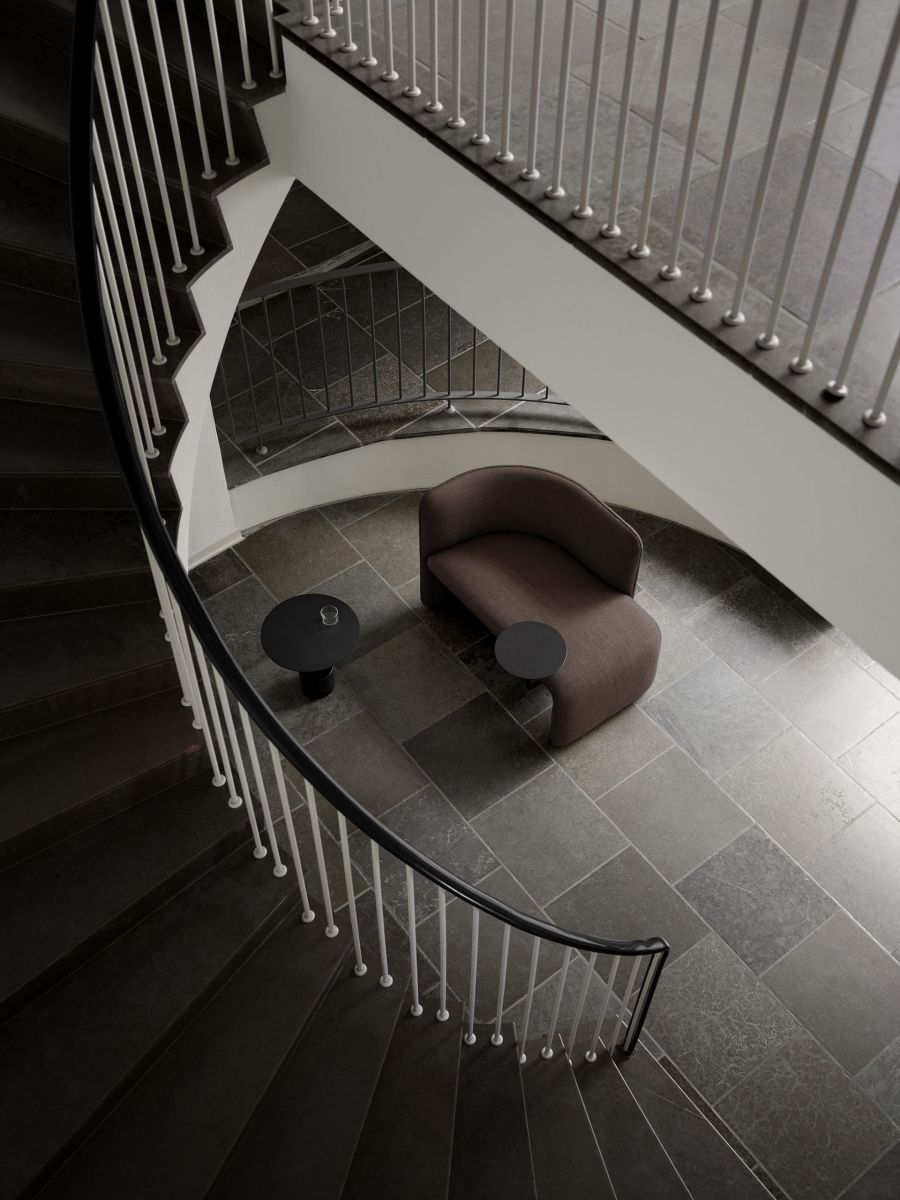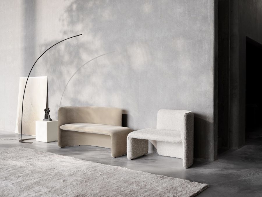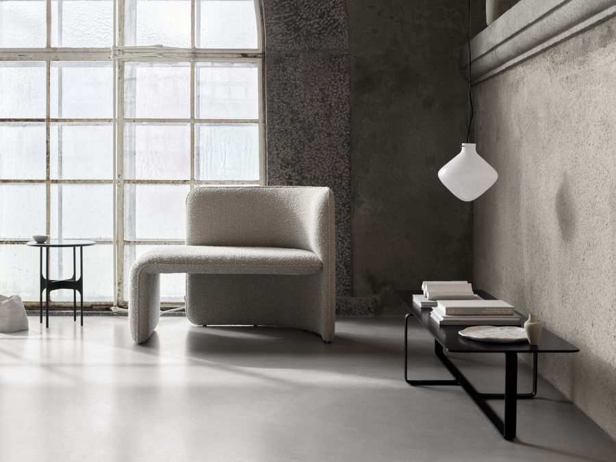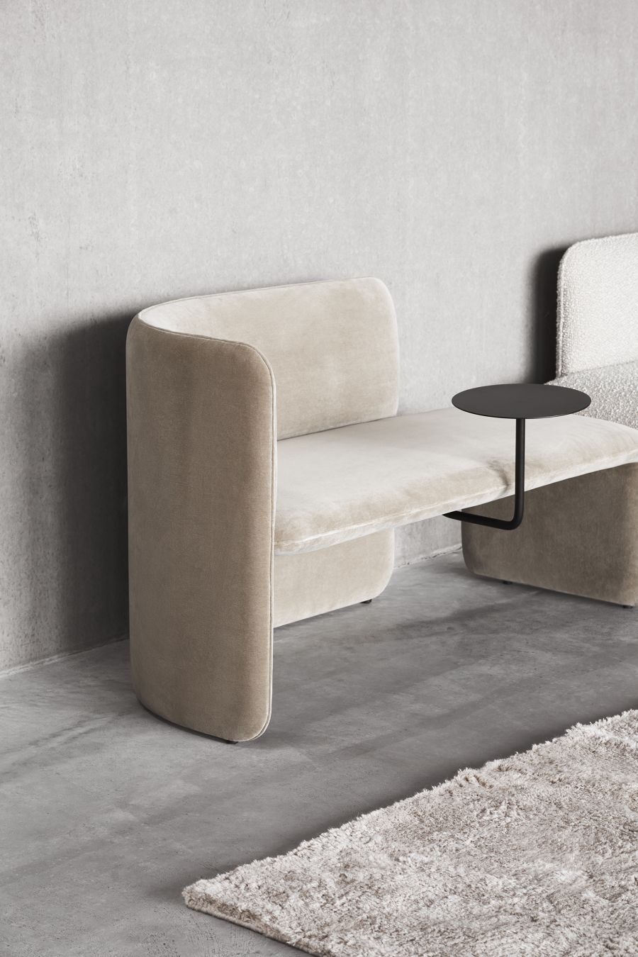 The design has a characterful persona with upholstered elements that bring a sense of softness to modern spaces, joined by the functionality of its curved back, allowing for the user to be seated at multiple positions, and the elegant side table.