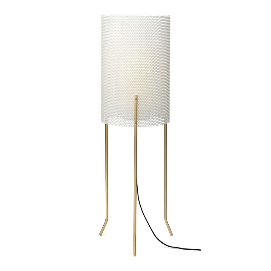 The shade is spun into shape from a piece of perforates steel. The brass parts are solid and brushed. All metal parts are lacquered. Dimmer on cable- black textile.